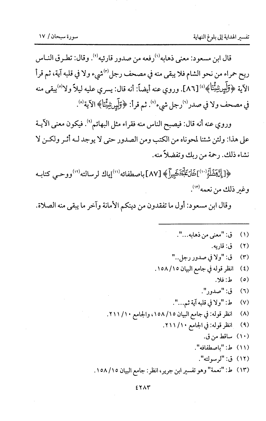 قال ابن مسعود: معنى ذهابه رفعه من صدور قارئيه. وقال: تطرق الناس ريح حمراء من نحو الشام فلا يبقى منه في مصحف رجل شيء ولا في قلبه آية، ثم قرأ الآية {وَلَئِن شِئْنَا}. وروي عنه أيضاً: أنه قال: يسري عليه ليلاً ولا يبقى منه في مصحف ولا في صدر رجل شيء. ثم قرأ: {وَلَئِن شِئْنَا} الآية.