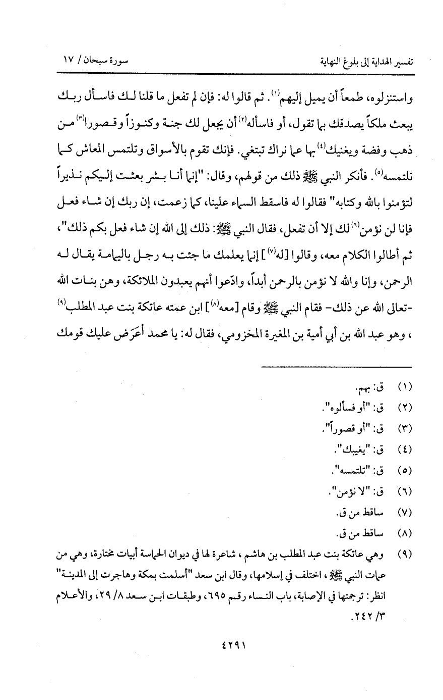 واستنزلوه، طمعاً أن يميل إليهم. ثم قالوا له: فإن لم تفعل ما قلنا لك فاسأل ربك يبعث ملكاً يصدقك بما تقول، أو فاسأله أن يجعل لك جنة وكنوزاً وقصوراً من ذهب وفضة ويغنيك بها عما نراك تبتغي. فإنك تقوم بالأسواق وتلتمس المعاش كما نلتمسه. فأنكر النبي A ذلك من قولهم، وقال: " إنما أنا بشر بعثت إليكم نذيراً لتؤمنوا بالله وكتابه " فقالوا له فاسقط السماء علينا، كما زعمت، إن ربك إن شاء فعل فإنا لن نؤمن لك إلا أن نفعل، فقال النبي A: ذلك إلى الله إن شاء فعل فإنا لن نؤمن لك إلا أن تفعل، فقال النبي A: ذلك إلى الله إن شاء فعل بكم ذلك "، ثم أطالوا الكلام معه، وقالوا [له] إنما يعلمك ما جئت به رجل باليمامة يقال له الرحمن، وإنا والله لا نؤمن بالرحمن أبداً، وادّعوا أنهم يعبدون الملائكة، وهن بنات الله - تعالى الله عن ذلك - فقال النبي A وقام [معه] ابن عمته عاتكة بنت عبد المطلب، وهو عبد الله بن أبي أمية بن المغيرة المخزومي، فقال له: يا محمد أعَرَض عليك قومك