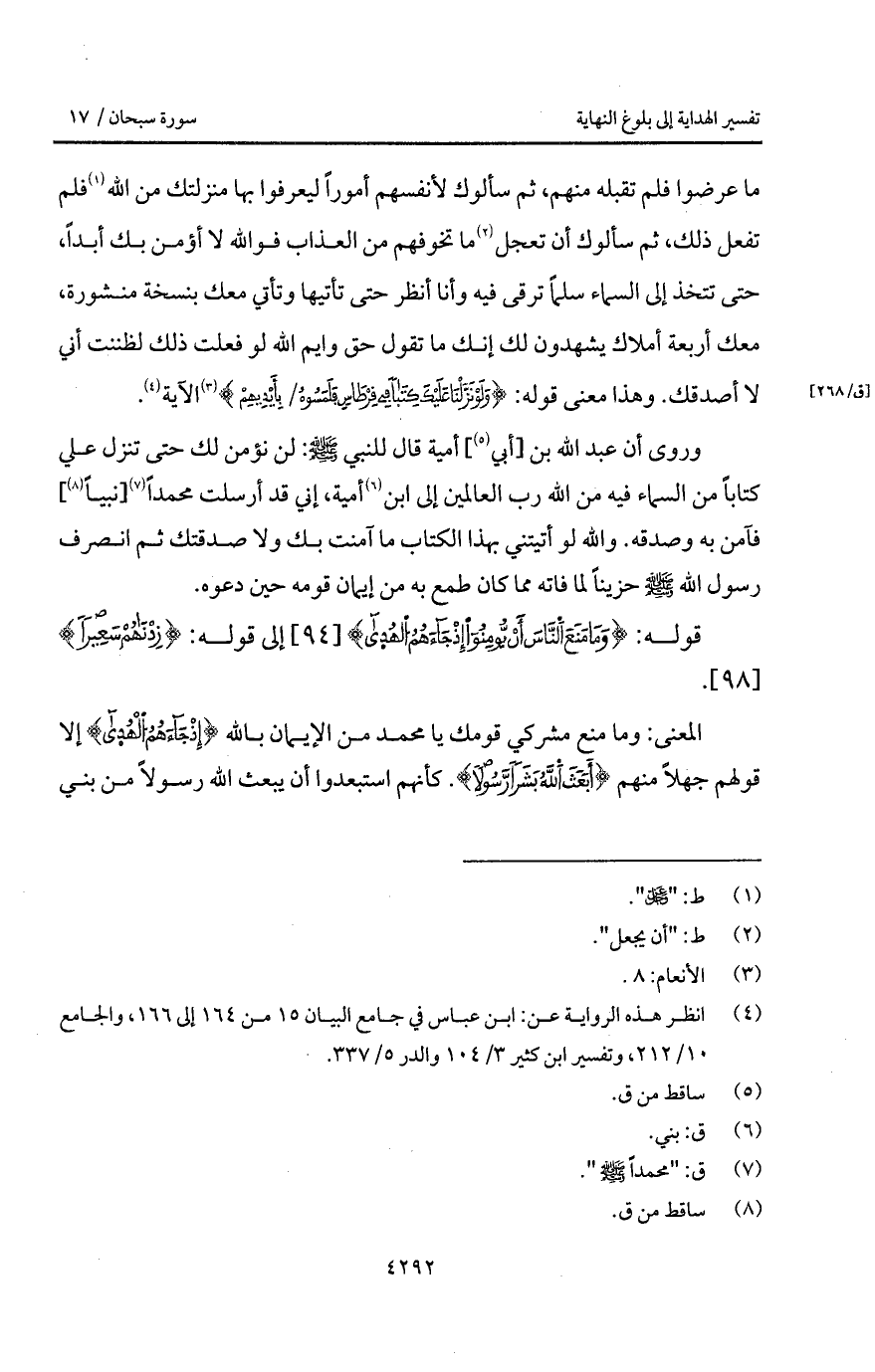 وروى أن عبد الله بن [أبي] أمية قال للنبي A: لن نؤمن لك حتى تنزل علي كتاباً من السماء فيه من الله رب العالمين إلى ابن أمية، إني قد أرسلت محمداً [نبياً] فآمن به وصدقه. والله لو أتيتني بهذا الكتاب ما آمنت بك ولا صدقتك ثم انصرف رسول الله A حزيناً لما فاته مما كان كمع به من إيمان قومه حين دعوه.