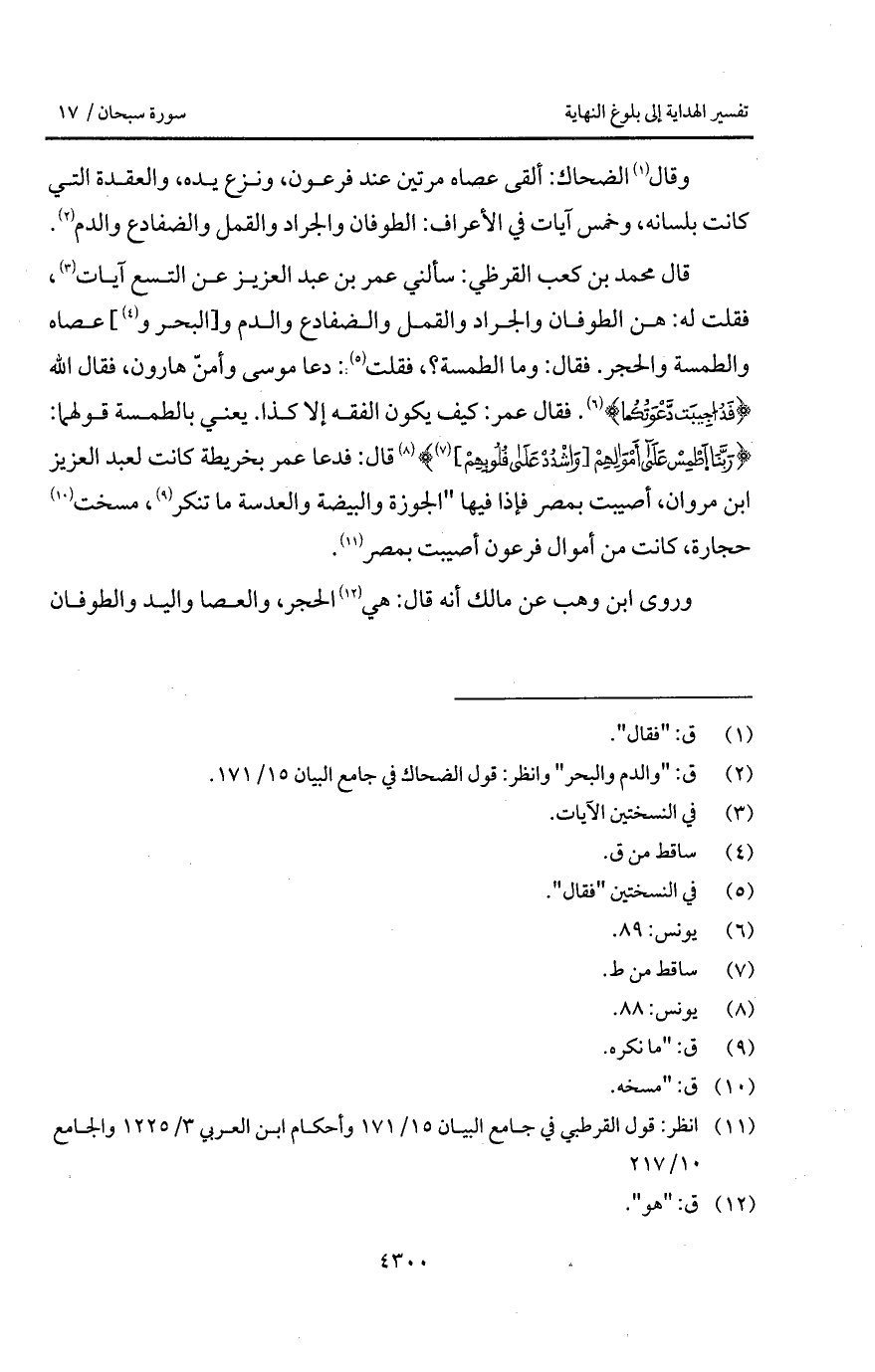 قال محمد بن كعب القرظي: سألني عمر بن عبد العزيز عن التسع آيات، فقلت له: هن الطوفان والجراد والقمل والضفادع والدم و [البحر و] عصاه والطمسة والحجر. فقال: وما الطمسة؟، فقلت: دعا موسى وأمنّ هارون، فقال الله {قَدْ أُجِيبَتْ دَّعْوَتُكُمَا} [يونس: 89]. فقال عمر: كيف يكون الفقه إلا كذا. يعني بالطمسة قولها: {رَبَّنَا اطمس على أَمْوَالِهِمْ [واشدد على قُلُوبِهِمْ]} [يونس: 88] قال: فدعا عمر بخريطة كانت لعبد العزيز ابن مروان، أصيبت بمصر فإذا فيها " الجوزة والبيضة والعدسة ما تنكر، مسخت حجارة، كانت من أموال فرعون أصيبت بمصر.