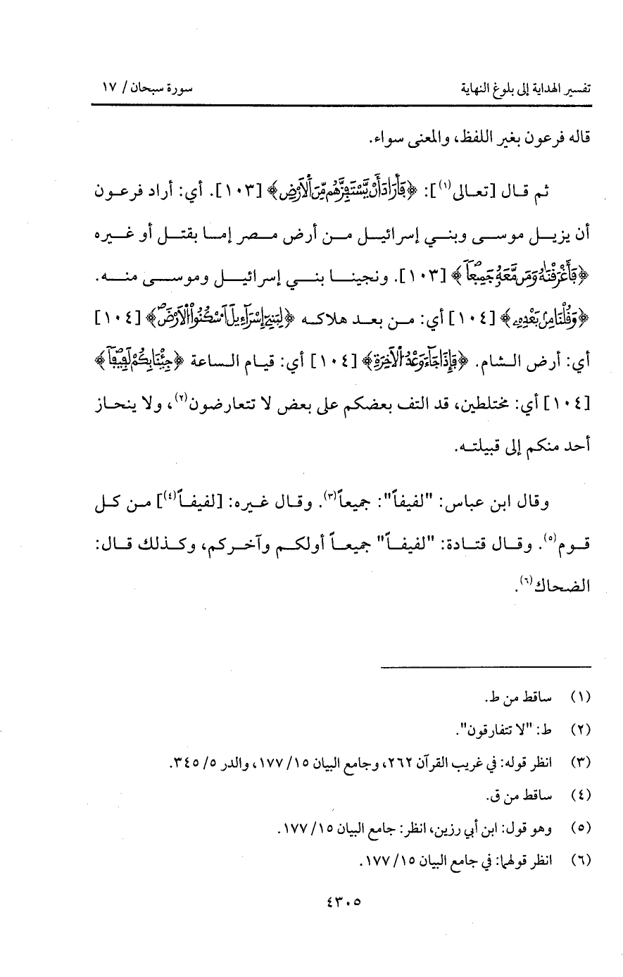 وقال ابن عباس: " لفيفاً ": جميعاً. وقال غيره: [لفيفاً] من كل قوم. وقال قتادة: " لفيفاً " جميعاً أولكم وآخركم، وكذلك قال: الضحاك.