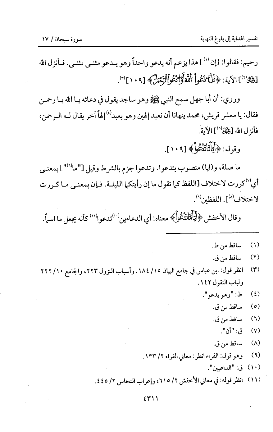 رحيم: فقالوا: [إن] هذا يزعم أنه يدعو واحداً وهو يدعو مثنى مثنى. فأنزل الله [ D] الآية: {قُلِ ادعوا الله أَوِ ادعوا الرحمن}.