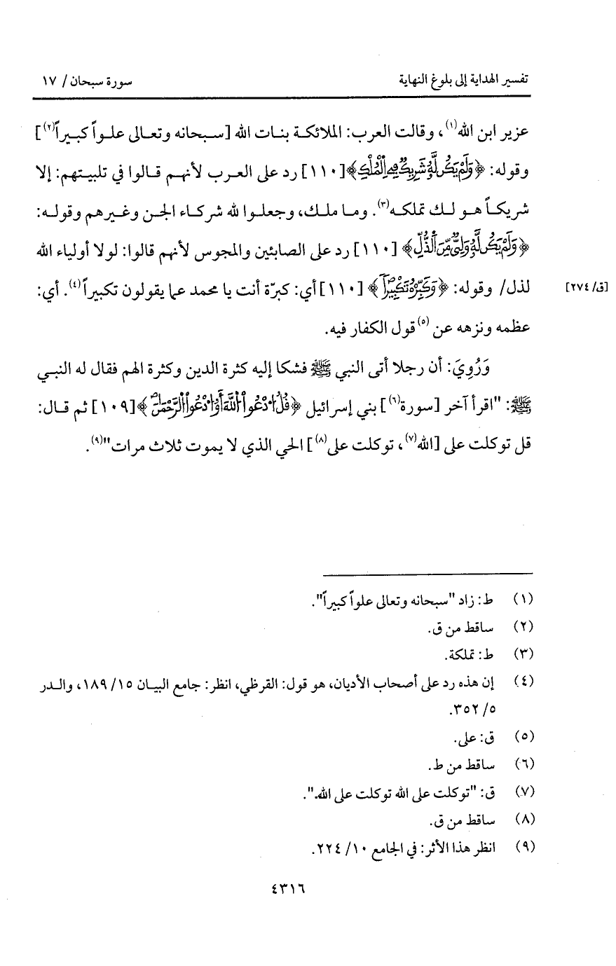 عزير ابن الله، وقالت العرب: الملائكة بنات الله [سبحانه وتعالى علواً كبيراً] وقوله: {وَلَم يَكُنْ لَّهُ شَرِيكٌ فِي الملك} رد على العرب لأنهم قالوا في تلبيتهم: إلا شريكاً هو لك تملكه. وما ملك، وجعلوا لله شركاء الجن وغيرهم وقوله: {وَلَمْ يَكُنْ لَّهُ وَلِيٌّ مِّنَ الذل} رد على الصابئين والمجوس لأنهم قالوا: لولا أولياء الله لذل / وقوله: {وَكَبِّرْهُ تَكْبِيراً} أي: كبرّة أنت يا محمد عما يقولون تكبيراً. أي: عظمه ونزهه عن قول الكفار فيه.