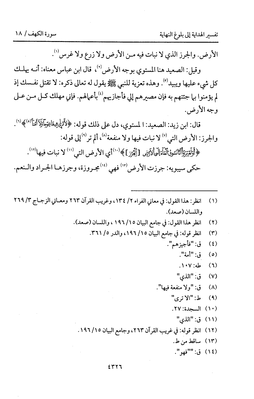 قال: ابن زيد: الصعيد: المستوي، دل على ذلك قوله: {لاَّ ترى فِيهَا عِوَجاً ولا أَمْتاً} [طه: 107]. والجزر: الأرض التي لا نبات فيها ولا منفعة، ألم تر إلى قوله: