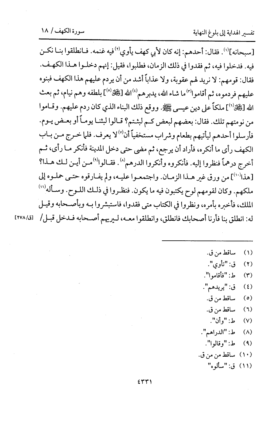 [سبحانه]. فقال: أحدهم: إنه كان لأبي كهف يأوي فيه غنمه. فانطلقوا بنا نكن فيه. فدخلوا فيه، ثم فقدوا في ذلك الزمان، فطلبوا، فقيل: إنهم دخلوا هذا الكهف. فقال: قومهم: لا نريد لهم عقوبة، ولا عذاباً أشد من أن يردم عليهم هذا الكهف فبنوه عليهم فردموه، ثم أقاموا ما شاء الله، يدبرهم الله [ D] بلطفه وهم نيام، ثم بعث الله [ D] ملكاً على دين عيسى A. ووقع ذلك البناء الذي كان ردم عليهم. وقاموا من نومتهم تلك. فقال: بعضهم لبعض كم لبثتم؟ قالوا لبثنا يوماً أو بعض يوم. فأرسلوا أحدهم ليأتيهم بطعام وشراب مستخفباً أن لا يعرف. فلما خرج من باب الكهف رأى ما أنكره، فأراد أن يرجع، ثم مضى حتى دخل المدينة فأنكر ما رأى، ثم أخرج درهماً فنظروا إليه، فأنكروه وأنكروا الدرهم. فقالوا من أين لك هذا؟ [هذا] من ورق غير هذا الزمان. واجتمعوا عليه، ولم يفارقوه حتى حملوه إلى ملكهم. وكان لقومهم لوح يكتبون فيه ما يكون. فنظروا في ذلك اللوح. وسأله الملك، فأخبره بأمره، ونظروا في الكتاب متى فقدوا، فاستبشروا به وبأصحابه وقيل له: انطلق بنا فأرنا أصحابك فانطلق، وانطلقوا معه، ليريهم أصحابه فدخل قبل /