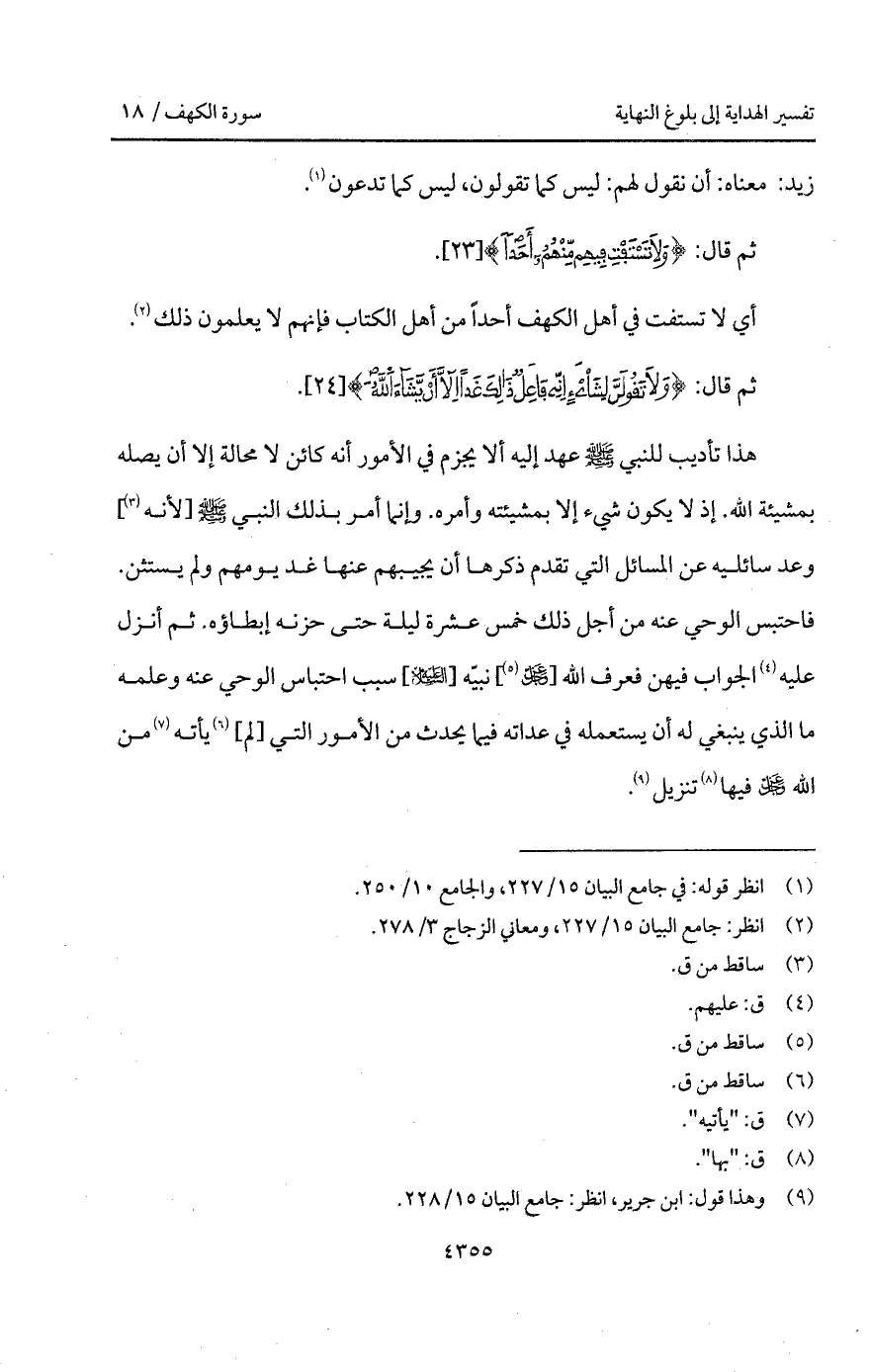 هذا تأديب للنبي A عهد إليه ألا يجزم في الأمور أنه كائن لا محالة إلا أن يصله بمشيئة الله. إذ لا يكون شيء إلا بمشيئته وأمره. وإنما بذلك النبي A [ لأنه] وعد سائليه عن المسائل التي تقدم ذكرها أن يجيبهم عنها غد يومهم ولم يستثن. فاحتبس الوحي عنه من أجل ذلك خمس عشرة ليلة حتى حزنه إبطاؤه. ثم أنزل عليه الجواب فيهن فعرف الله [ D] نبيّه [عليه السلام] سبب احتباس الوحي عنه وعلمه ما الذي ينبغي له أن يستعمله في عداته فيما يحدث من الأمور التي [لم] يأته من الله عز وجل فيها تنزيل.