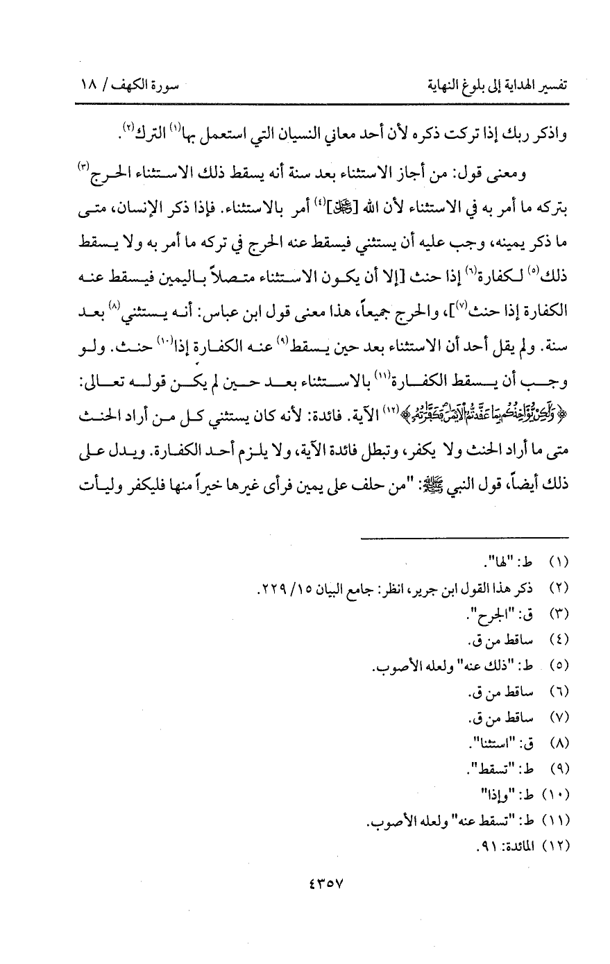 ومعنى قول: من أجاز الاستثناء بعد سنة أنه يسقط ذلك الاستثناء الحرج بتركه ما أمر به في الاستثناء لأن الله [ D] أمر بالاستثناء. فإذا ذكر الإنسان، متى ما ذكر يمينه، وجب عليه أن يستثني فيسقط عنه الحرج في تركه ما أمر به ولا يسقط ذلك لكفارة إذا حنث [إلا أن يكون الاستثناء متصلاً باليمين فيسقط عنه الكفارة إذا حنث]، والحرج جميعاً، هذا معنى قول ابن عباس: أنه يستثني بعد سنة. ولم يقل أحد أن الاستثناء بعد حين يسقط عنه الكفارة إذا حنث. ولو وجب أن يسقط الكفارة بالاستثناء بعد حين لم يكن قوله تعالى: {ولكن يُؤَاخِذُكُم بِمَا عَقَّدتُّمُ الأيمان فَكَفَّارَتُهُ} [المائدة: 91] الآية. فائدة: لأنه كان يستثني كل من أراد الحنث متى ما أراد الحنث ولا كفر، وتبطل فائدة الآ] ة، ولا يلزم أحد الكفارة. ويدل على ذلك أيضاً، قول النبي A: " من حلف على يمين فرأى غيرها خيراً منها فليكفر وليأت