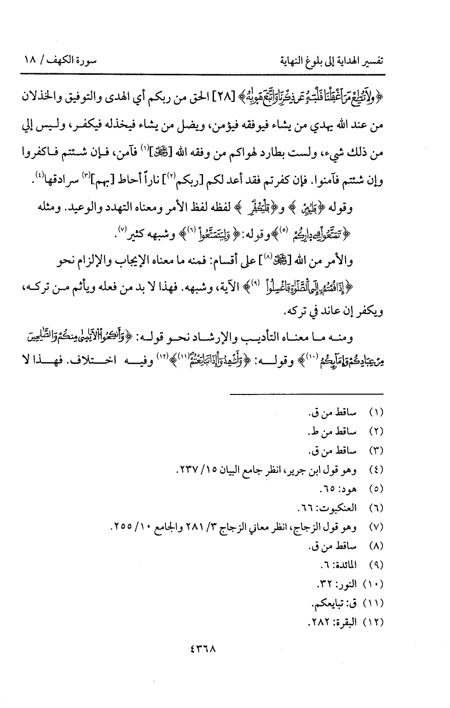 {وَلاَ تُطِعْ مَنْ أَغْفَلْنَا قَلْبَهُ عَن ذِكْرِنَا واتبع هَوَاهُ} [الكهف: 28] الحق من ربكم أي الهدى والتوفيق والخذلان من عند الله يهدي من يشاء فيوفقه فيؤمن، ويضل من يشاء فيخذله فيكفر، وليس إلي من ذلك شيء، ولست بطارد لهواكم من وفقه الله [ D] فآمن، فإن شئتم فاكفروا وإن شئتم فآمنوا. فإن كفرتم فقد أعد لكم [ربكم] ناراً أحاط [بهم] سرادقها.