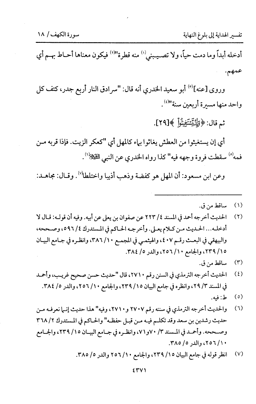 وروى [عنه] أبو سعيد الخدري أنه قال: " سرادق النار أربع جدر، كتف كل واحد منها مسيرة أربعين سنة ".