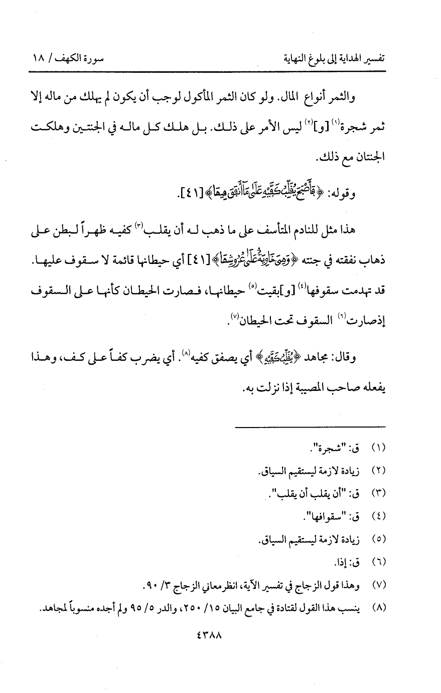 وقال: مجاهد {يُقَلِّبُ كَفَّيْهِ} أي يصفق كفيه. أي يضرب كفاً على كف، وهذا يفعله صاحب المصيبة إذا نزلت به.