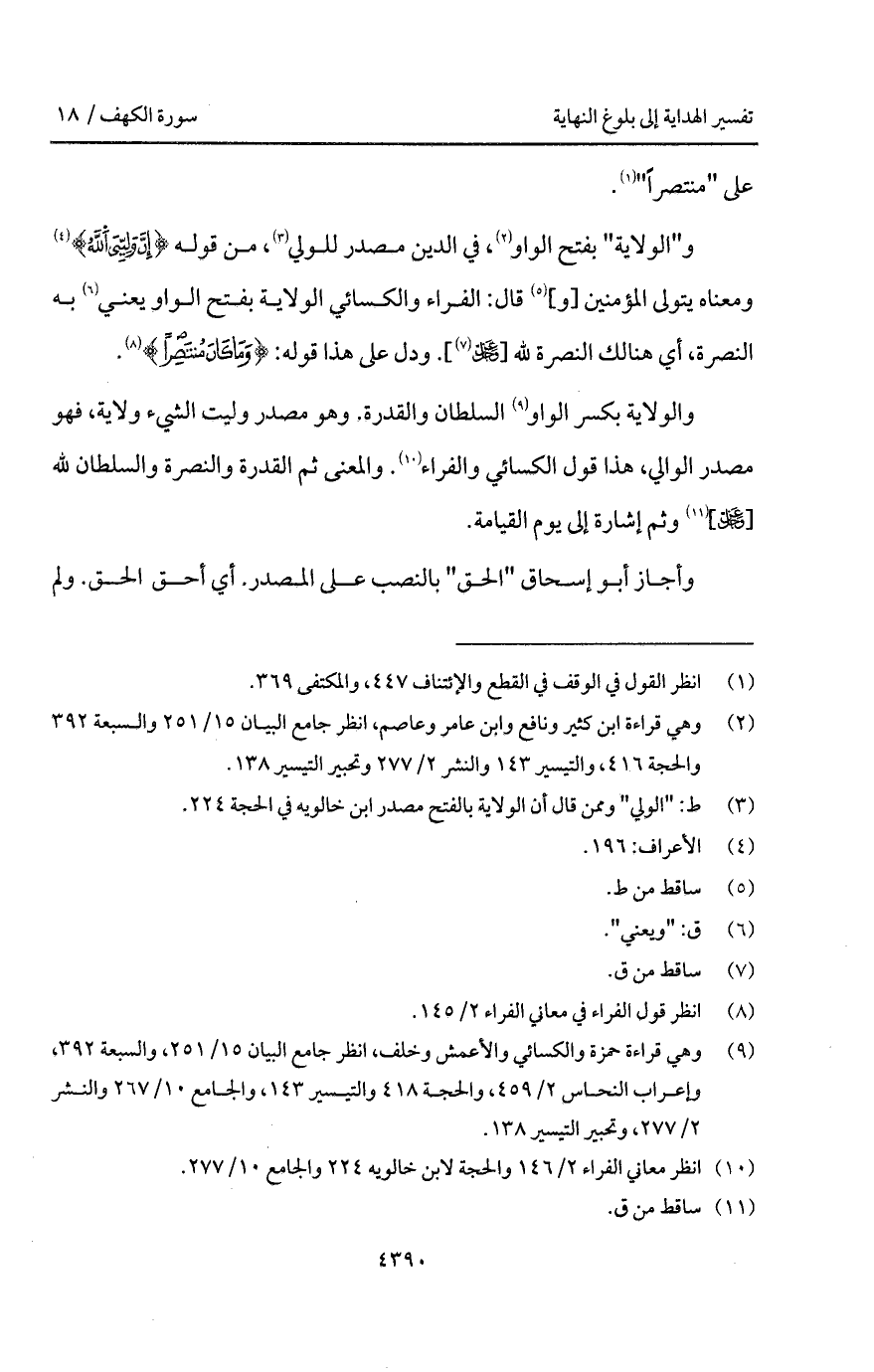و" الولاية " بفتح الواو، في الدين مصدر للولي، من قوله {إِنَّ وَلِيِّيَ الله} [الأعراف: 196] ومعناه يتولى المؤمنين [و] قال: الفراء والكسائي الولاية بفتح الواو يعني به النصرة، أي هنالك النصرة لله [ D] . ودل على هذا قوله: {وَمَا كَانَ مُنْتَصِراً}.
