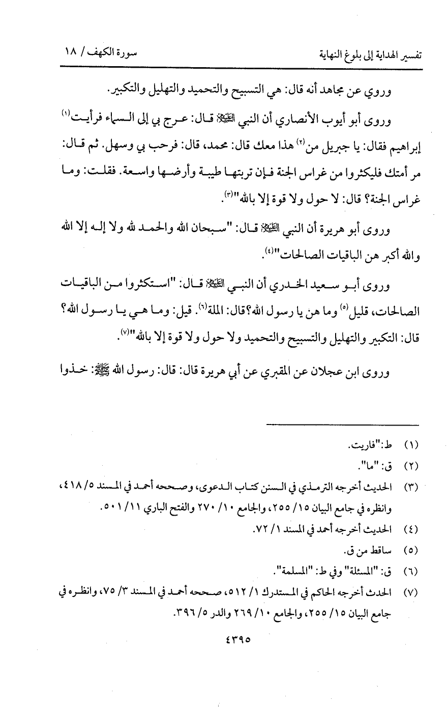وروى أبو سعيد الخدري أن النبي عليه السلام قال: " استكثروا من الباقيات الصالحات، قليل وما هن يا رسول الله؟ قال: الملة. فيل: وما هي يا رسول الله؟ قال: التكبير والتهليل والتسبيح والتحميد ولا حول ولا قوة إلا بالله ".