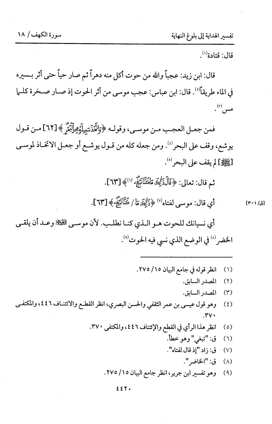 قال: ابن زيد: عجباً والله من حوت أكل منه دهراً ثم صار حياً حتى أثر يسيره في الماء طريقاً. قال: ابن عباس: عجب موسى من أثر الحوت إذ صار صخرة كلما مس.