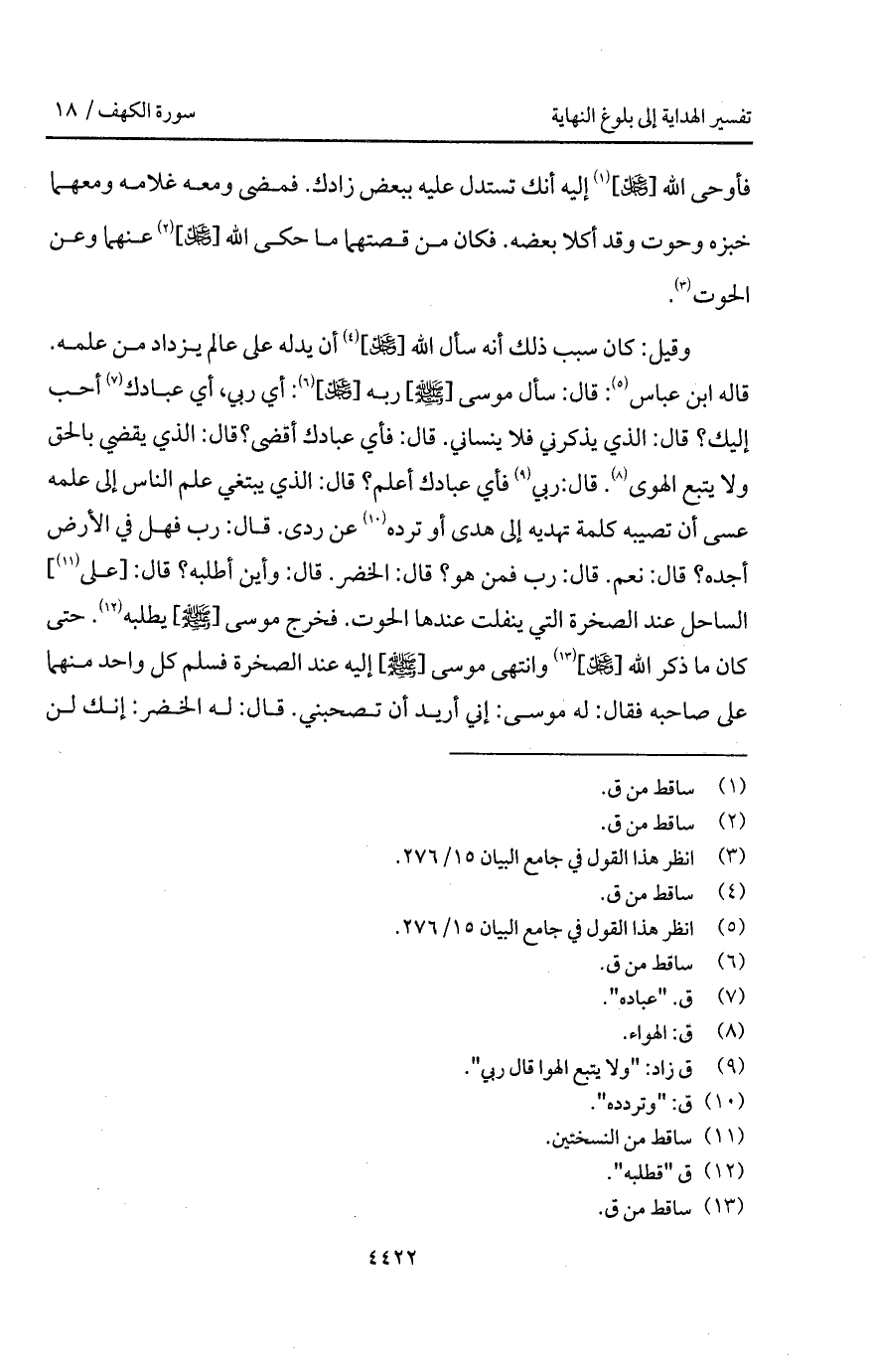 وقيل: كان سبب ذلك أنه سأل الله [ D] أن يدله على عالم يزداد من علمه. قاله ابن عباس: قال: سأل موسى [ A] ربه [ D] : أي ربي، أي عبادك أحب إليك؟ قال: الذي يذكرني فلا ينساني. قال: فأي عبادك أقضى؟ قال: الذي يقضي بالحق ولا يتبع الهوى. قال: ربي فأي عبادك أعلم؟ قال: الذي يبتغي علم الناس إلى علمه عسى أن تصيبه كلمة تهديه إلى هدى أو ترده عن ردى. قال: رب فهل في الأرض أجده؟ قال: نعم. قال: رب فمن هو؟ قال: الخضر. قال: زأين أطلبه؟ قال: [على] الساحل عند الصخرة التي ينفلت عندها الحوت. فخرج موسى [ A] يطلبه. حتى كان ما ذكر الله [ D] وانتهى موسى [ A] إليه عند الصخرة فسلم كل واحد منهما على صاحبه فقال: له موسى: إني أريد أن تصحبني. قال: له الخضر: إنك لن