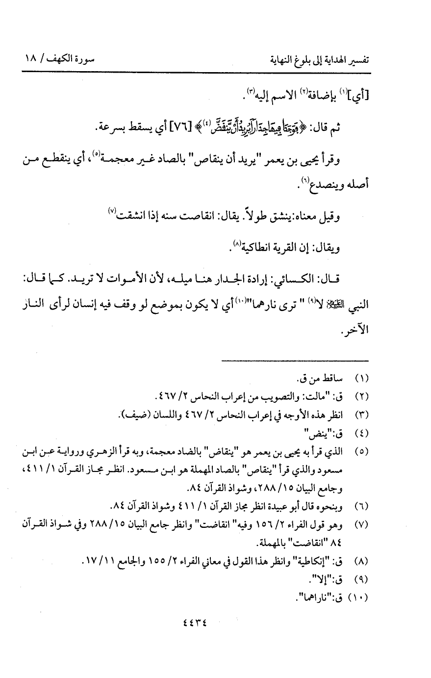 قال: الكسائي: إرادة الجدار هنا ميله، لأن الأموات لا تريد. كما قال: النبي عليه السلام لا " ترى نارهما " أي لا يكون بموضع لو وقف فيه إنسان لرأى النار الآخر.