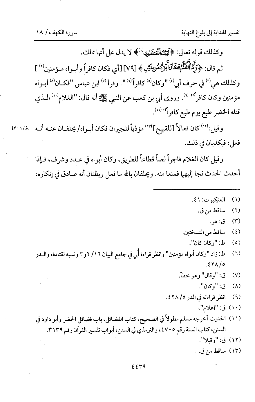 قال: {وَأَمَّا الغلام فَكَانَ أَبَوَاهُ مُؤْمِنَيْنِ} [أي فكان كافراً وأبواه مؤمنين] وكذلك هي في حرف أبي " وكان كافراً ". وقرأ ابن عباس " فكان أبواه مؤمنين وكان كافراً ". وروى أبي بن كعب عن النبي A أنه قال: " الغلام الذي قتله الخضر طبع يوم طبع كافراً ".