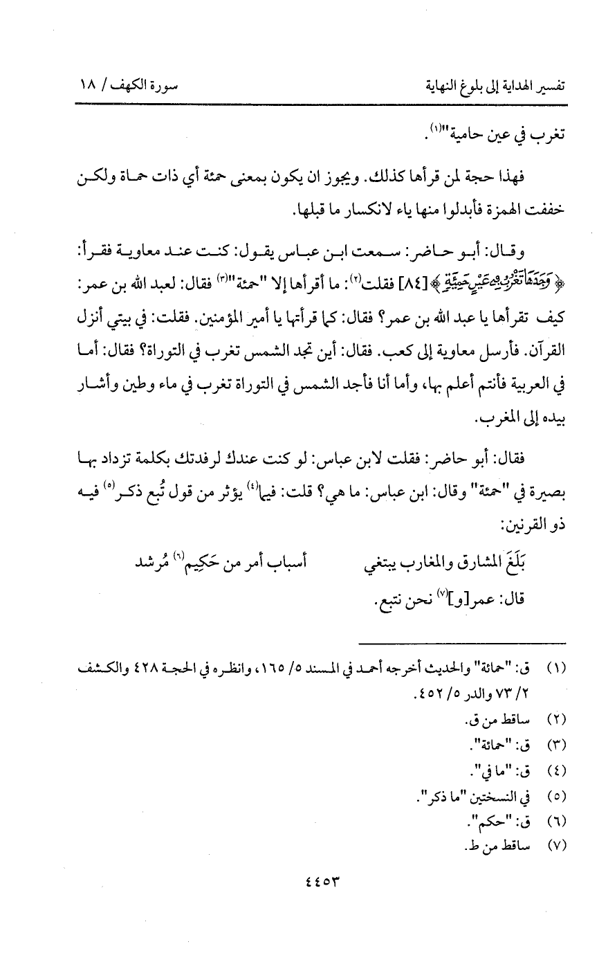 وقال: أبو حاضر: سمعت ابن عباس يقول: كنت عند معاوية فقرأ: {وَجَدَهَا تَغْرُبُ فِي عَيْنٍ حَمِئَةٍ} فقلت: ما أقرأها إلا " حمئة " فقال: لعبد الله بن عمر: كيف تقرأها يا عبد الله بن عمر؟ فقال: كما قرأتها يا أمير المؤمنين. فقلت: في بيتي أنزل القرآن. فأرسل معاوية إلى كعب. فقال: أين تجد الشمس تغرب في التوراة؟ فقال: أما في العربية فأنتم أعلم بها، وأما أنا فأجد الشمس في التوراة تغرب في ماء وطين وأشار بيده إلى المغرب.