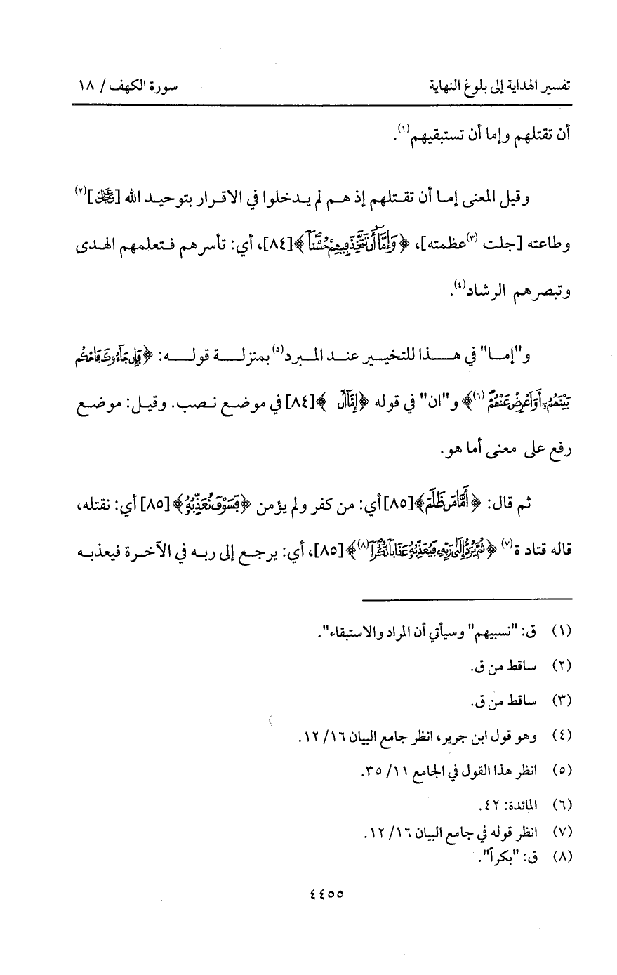 وقيل المعنى إما أن تقتلهم إذ هم لم يدخلوا في الاقرار بتوحيد الله [ D] وطاعته [جلت عظمته]، {وَإِمَّآ أَن تَتَّخِذَ فِيهِمْ حُسْناً}، أي: تأسرهم فتعلمهم الهدى وتبصرهم الرشاد.