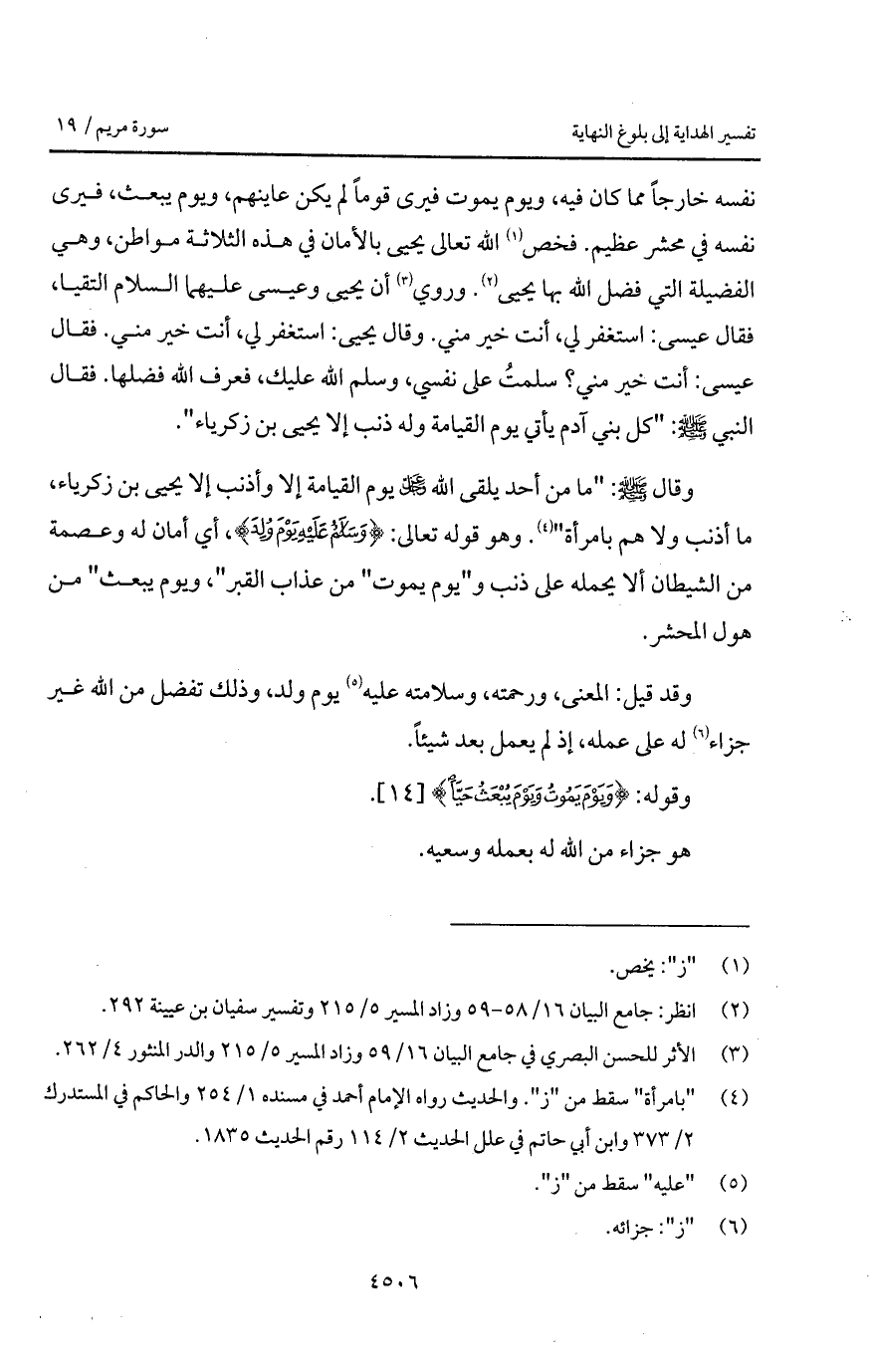 نفسه خارجاً مما كان فيه، ويوم يموت فيرى قوماً لم يكن عاينهم، ويوم يبعث، فيرى نفسه في حشر عظيم. فخض الله تعالى يحيى بالأمان في هذه الثلاثة مواطن، وهي الفضيلة التي فضل الله بها يحيى. وروي أن يحيى وعيسى عليهما السلام التقيا، فقال عيسى استغفر لي، أنت خير مني. وقال يحيى: استغفر لي، أنت خير مني. فقال عيسى: أنت خير مني؟ سلمتُ على نفسي، وسلم الله عليك، فعرف الله فضلها. فقال النبي A: " كل بني آدم يأتي يوم القيامة وله ذنب إى يحيى بن زكرياء ".