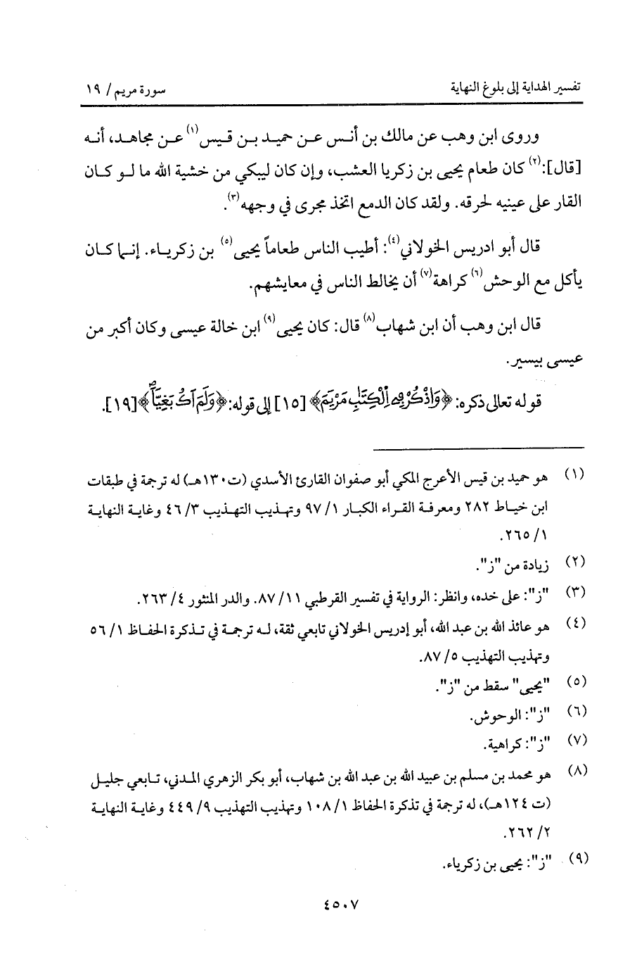 وروى ابن وهب عن مالك بن أنس عن حميد بن قيس عن مجاهد، أنه [قال]: كان طعام يحيى بن زكريا العشب، وإن كان ليبكي من خسية الله ما لو كان القار على عينيه لحرقه. ولقد كان الدمع اتخذ مجرى في وجهه.