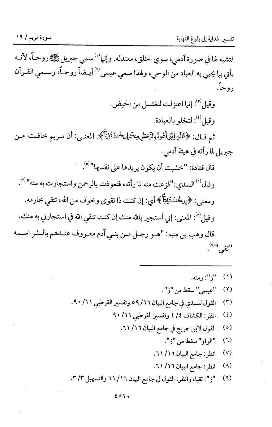 فتشبه لها في صورة آدمي، سوي الخلق، معتدلة. وإنما سمي جبريل A روحاً، لأنه يأتي بما يحيي به العباد من الوحي، ولهذا سمي عيسى أيضاً روحاً، وسمي القرآن روحاً.