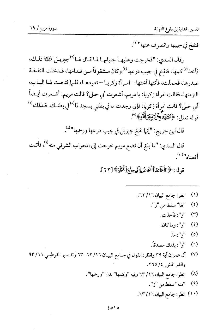 وقال السدي: " فخرجت وعليها جلبابها لما قال لها جبريل عليه السلام ذلك، فأخذ كمها، فنفخ في جيب درعها وكان مشقوقاً من قدامها، فدخلت النفخة صدرها، فحملت فأتتها أختها - امرأة زكريا - تعودها، فلما فتحت لها الباب، التزمتها، فقالت امرأة زكريا: يا مريم، أشعرت أني حبلى؟ قالت مريم: أشعرت أيضاً أني حبلى؟ قالت امرأة زكريا: فإني وجدت ما في بطني يسجد لما في بطنك. فذلك قوله تعالى: