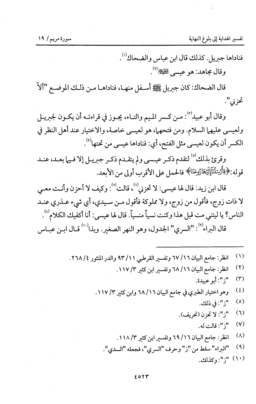 وقال أبو عبيد: من كسر الميم والتاء، يجوز في قراءته أن يكون لجبريل ولعيسى عليهما السلام. ومن فتحهما، هو لعيسى خاصة، والاختيار عند أهل النظر في الكسر أن يكون لعيسى مثل الفتح، أي: فناداها عيسى من تحتها.
