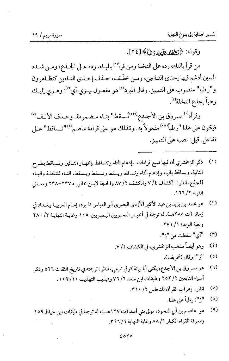 من قرأ بالتاء، رده على النخلة ومن قرأ بالياء، رده على الجذع، ومن شدد السين أدغم فيها إحدى التاءين، ومن خفّف، حذف إحدى التاءين كتظاهرون و " رطبا " منصوب على التمييز. وقال المبرد هو مفعول بهزي أي: وهزي إليك رطباً بجذع النخلة.