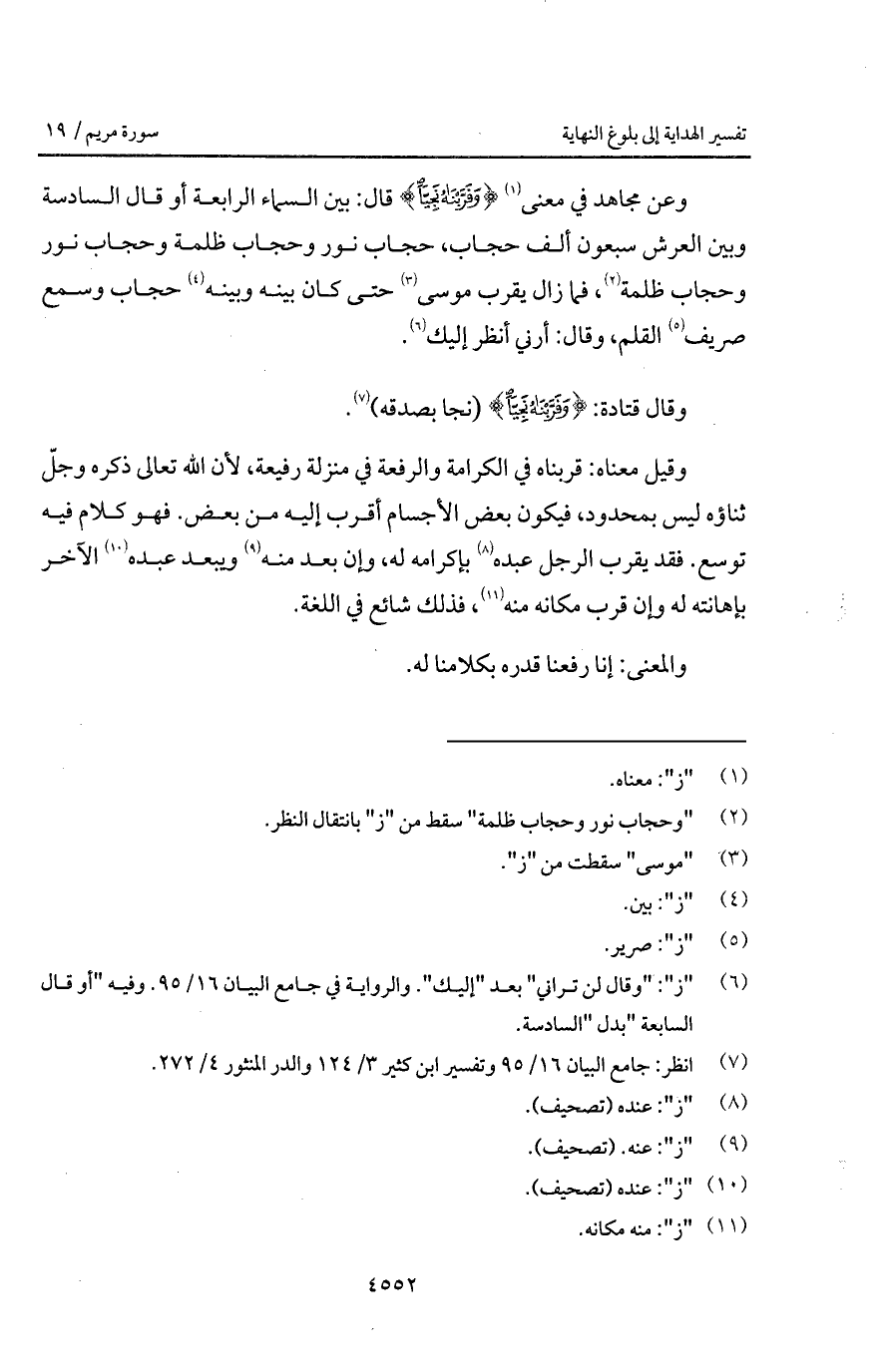 وعن مجاهد في معنى {وَقَرَّبْنَاهُ نَجِيّاً} قال: بين السماء الرابعة أو قال السادسة وبين العرش سبعون ألف حجاب، حجاب نور وحجاب ظلمة وحجاب نور وحجاب ظلمة، فما زال يقرب موسى حتى كان بينه وبينه حجاب وسمع صريف القلم، وقال: أرني أنظر إليك.