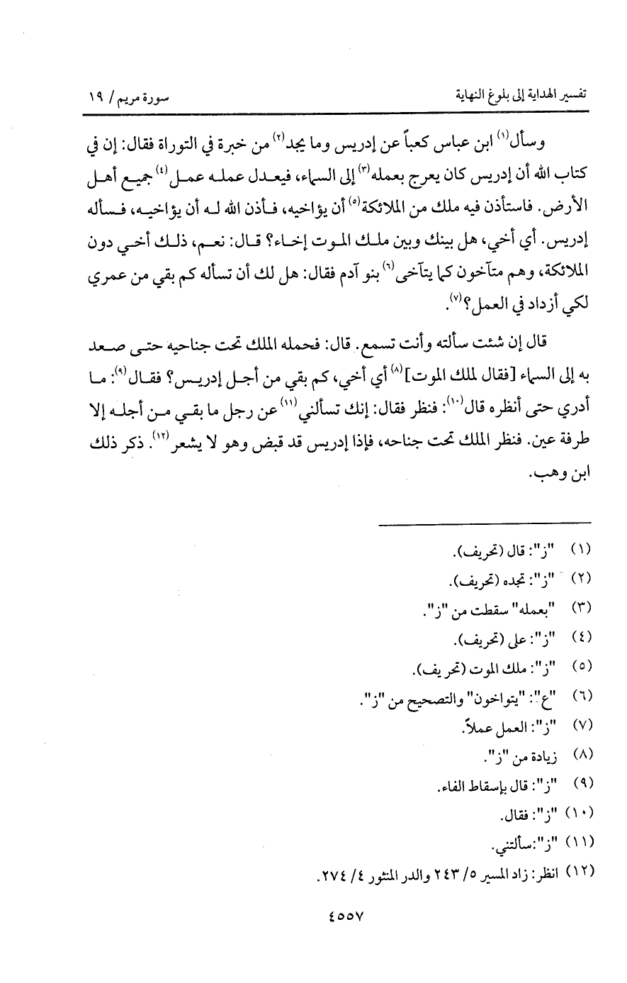 وسأل ابن عباس كعباً عن إدريس وما يجد من خيرة في التوراة فقال: إن في كتاب الله أن إدريس كان يعرج بعمله إلى السماء، فيعدل عمله عمل جميع أهل الارض. فأستأذن فيه ملك من الملائكة أن يؤاخيه، فأذن الله له أن يؤاخيه، فسأله إدريس؟ أي أخي، هل بينك وبين ملك الموت إخاء؟ قال: نعم، ذلك أخي دون الملائكة، وهم متآخرون كما يتآخى بنو آدم فقال: هل لك أن تسأله كم بقي من عمري لكي أزداد في العمل؟.