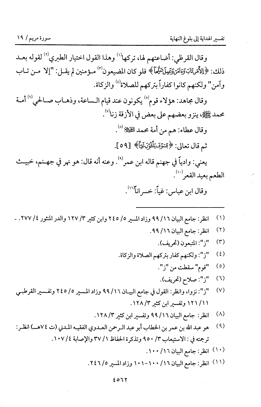 وقال القرظي: أضاعتهم لها، تركها وهذا القول اختيار الطبري لقوله بعد ذلك: {إِلاَّ مَن تَابَ وَآمَنَ وَعَمِلَ صَالِحاً} فلو كان المضيعون مؤمنين لم يقل: " إلا من تاب وآمن " ولكنهم كانوا كفاراً بتركهم للصلاة والزكاة.