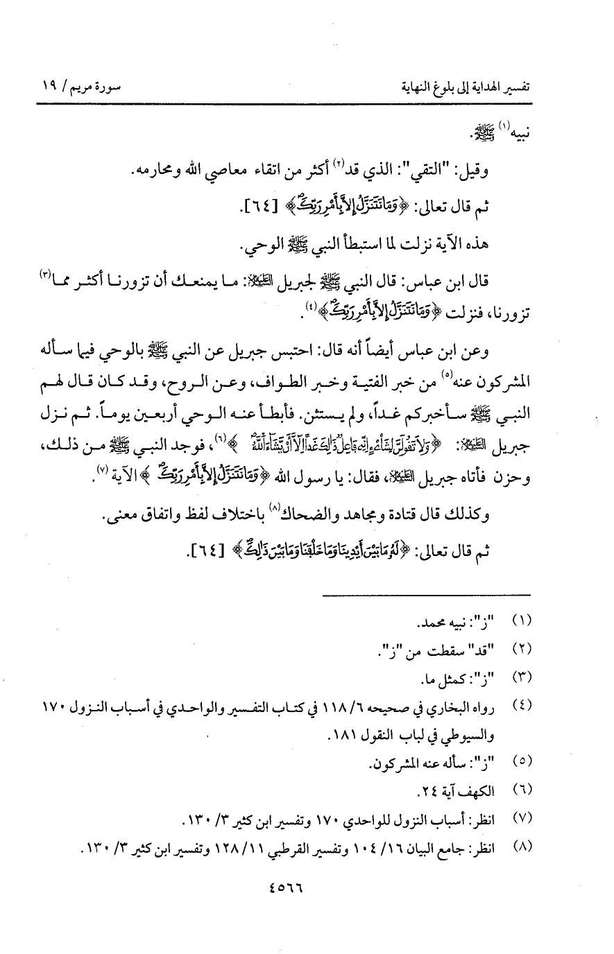 وعن ابن عباس أيضاً أنه قال: احتبس جبريل عن النبي A بالوحي فيما سأله المشركون عنه من خبر الفتية وخبر الطواف، وعن الروح، وقد كان قال لهم النبي A سأخبركم غداً، ولم يستثن. فأبطأ عنه الوحي أربعين يوماً. ثم نزل جبريل عليه السلام: {وَلاَ تَقُولَنَّ لِشَاْىءٍ إِنِّي فَاعِلٌ ذلك غَداً * إِلاَّ أَن يَشَآءَ الله} [الكهف: 23 - 24]، فوجد النبي A من ذلك، وحزن فأتاه جبريل عليه السلام، فقال: يا رسول الله {وَمَا نَتَنَزَّلُ إِلاَّ بِأَمْرِ رَبِّكَ} الآية.