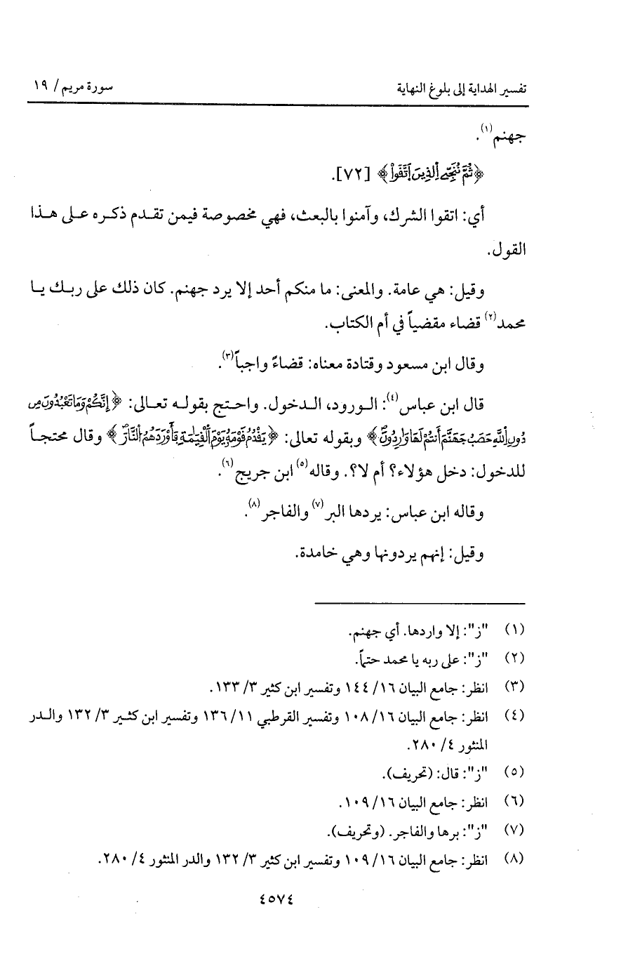 قال ابن عباس: الورود، الدخول. واحتج بقوله تعالى: {إِنَّكُمْ وَمَا تَعْبُدُونَ مِن دُونِ الله حَصَبُ جَهَنَّمَ أَنتُمْ لَهَا وَارِدُونَ} وبقوله تعالى: {يَقْدُمُ قَوْمَهُ يَوْمَ القيامة فَأَوْرَدَهُمُ النار} وقل محتجاً للدخول: دخل هؤلاء؟ أم لا؟. وقاله ابن جريج.