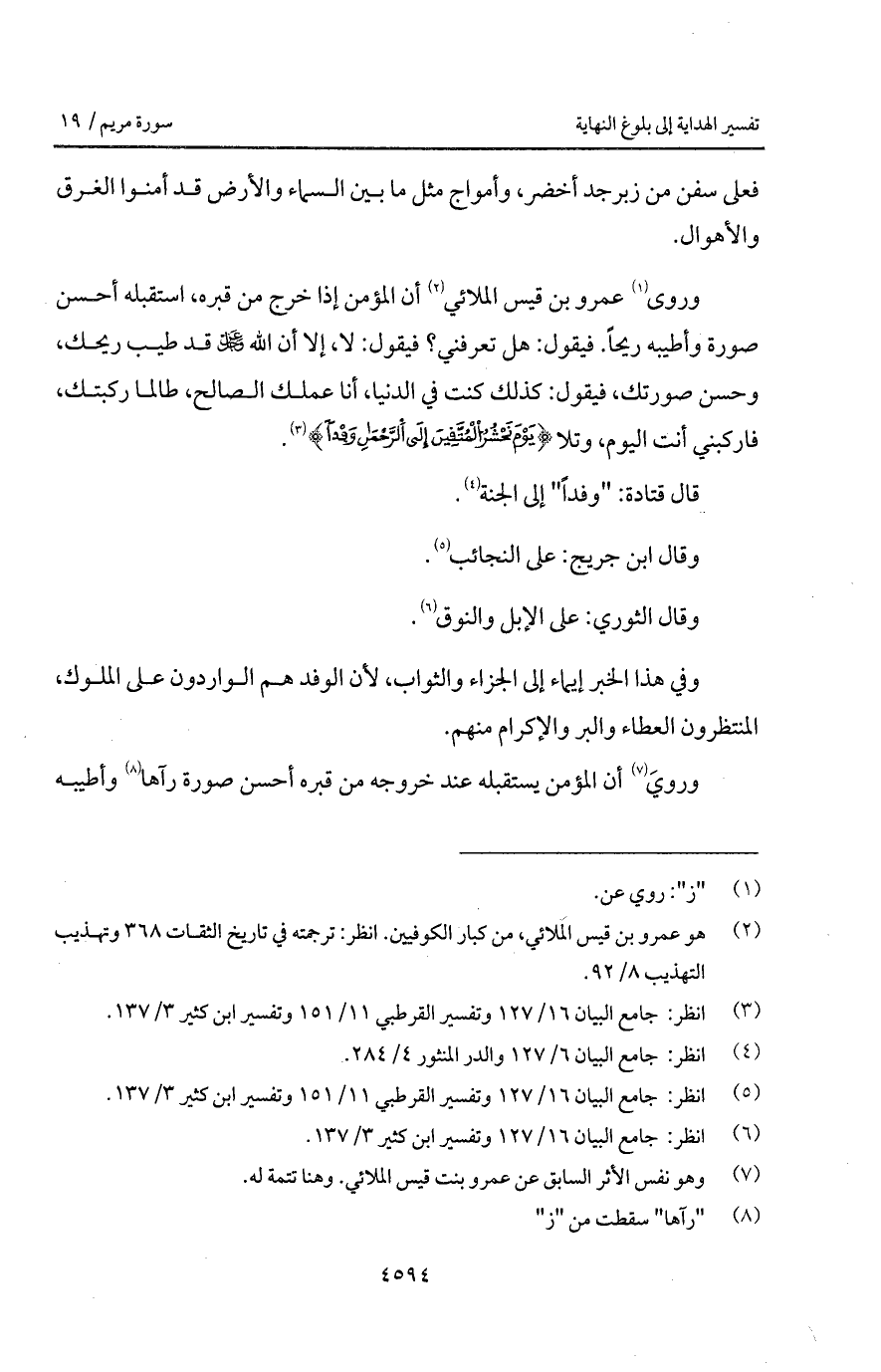 وروى عمرو بن قيس الملائي أن المؤمن إذاخرج من قبره، استقبله أحسن صورة وأطيبه ريحاً. فيقول: هل تعرفني؟ فيقول: لا، إلا أن الله D قد طيب ريحك، وحسن صورتك، فيقول: كذلك كنت في الدنيا، أنا عملك الصالح، طالما ركبتك، فاركبني أنت اليوم، وتلا {يَوْمَ نَحْشُرُ المتقين إِلَى الرحمن وَفْداً}.