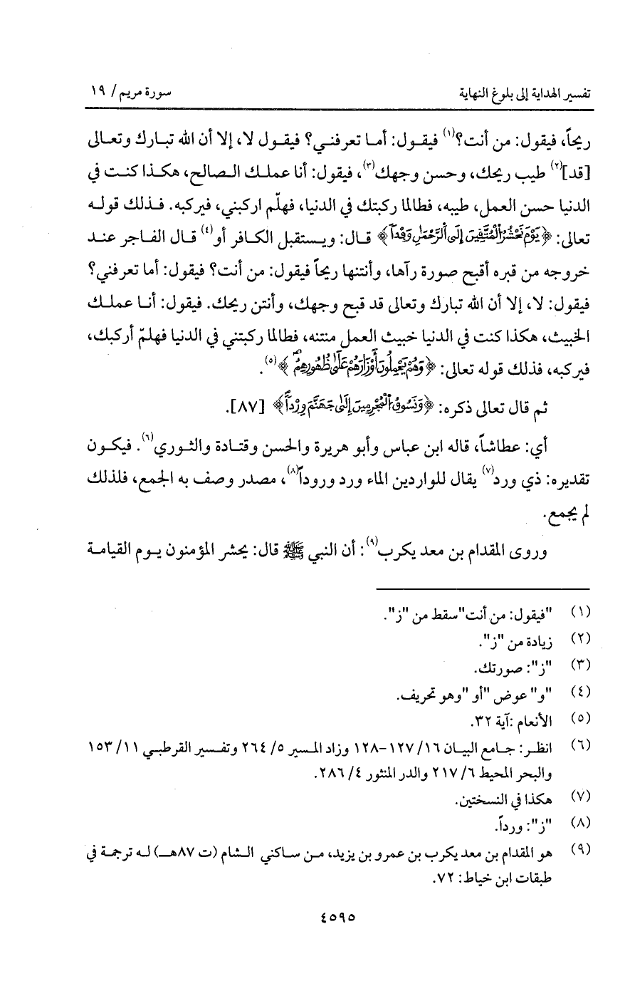 ريحاً، فيقول: من أنت؟ فيقول: أما تعرفني؟ فيقول لا، إلا أن الله تبارك وتعالى [قد] طيب ريحك، وحسن وجهك، فيقول: أنا عملك الصالح، هكذا كنت في الدنيا حسن العمل، طيبه، فطالما ركبتك في الدنيا، فهلّما اركبني، فيركبه. فذلك قوله تعالى: {يَوْمَ نَحْشُرُ المتقين إِلَى الرحمن وَفْداً} قال: ويستقبل الكافر أو قال الفاجر عند خروجه من قبره أقبح صورة رآها، وأنتنها ريحاً فيقول: من أنت؟ فيقول: أما تعرفين؟ فيقول: لا، إلا أن الله تبارك وتعالى قد قبح وجهك، وأنتن ريحك. فيقول: أنا عملك الخبيث، هكذا كنت في الدنيا خبيث العمل منتنه، فطالما ركبتني في الدنيا فهلمّ أركبك، فيركبه، فذلك قوله تعالى: {وَهُمْ يَحْمِلُونَ أَوْزَارَهُمْ على ظُهُورِهِمْ} [الأنعام: 31].