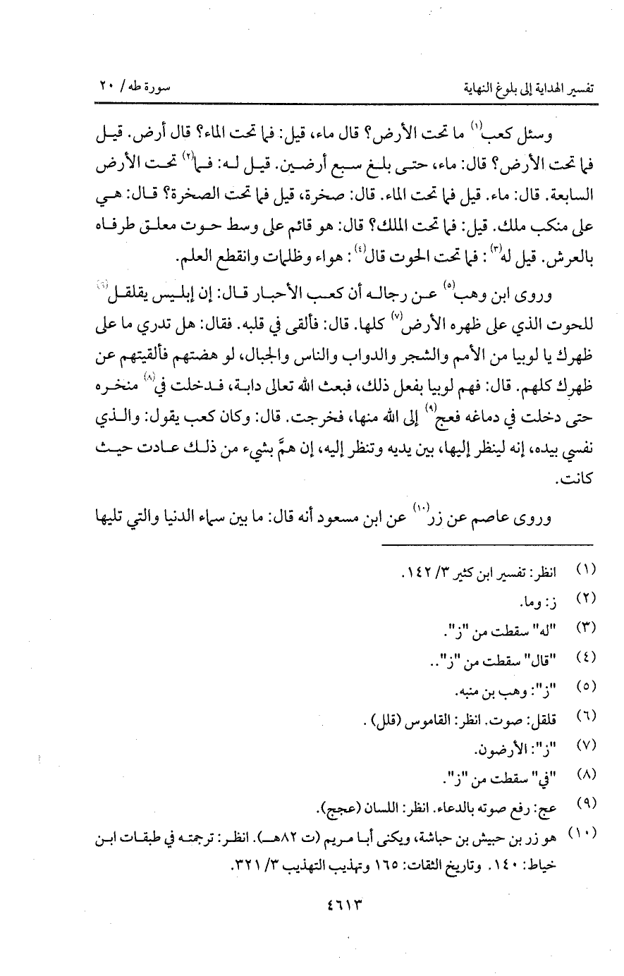 وسئل كعب ما تحت الأرض؟ قال ماء، قيل: فما تحت الماء؟ قال أرض. قيل فما تحت الأرض؟ قال: ماء، حتى بلغ سبع أرضين. قيل: له: لما تحت الأرض السابعة. قال: ماء. قيل فما حت الماء. قال صخرة، قيل فما تحت الصخرة؟ قال: هي على منكب ملك. قيل: فما تحت الملك؟ قال: هو قائم على وسط حوت معلق طرفاه بالعرش. قيل له: فما تحت الحوت قال: هواء وظلمات وانقطع العلم.