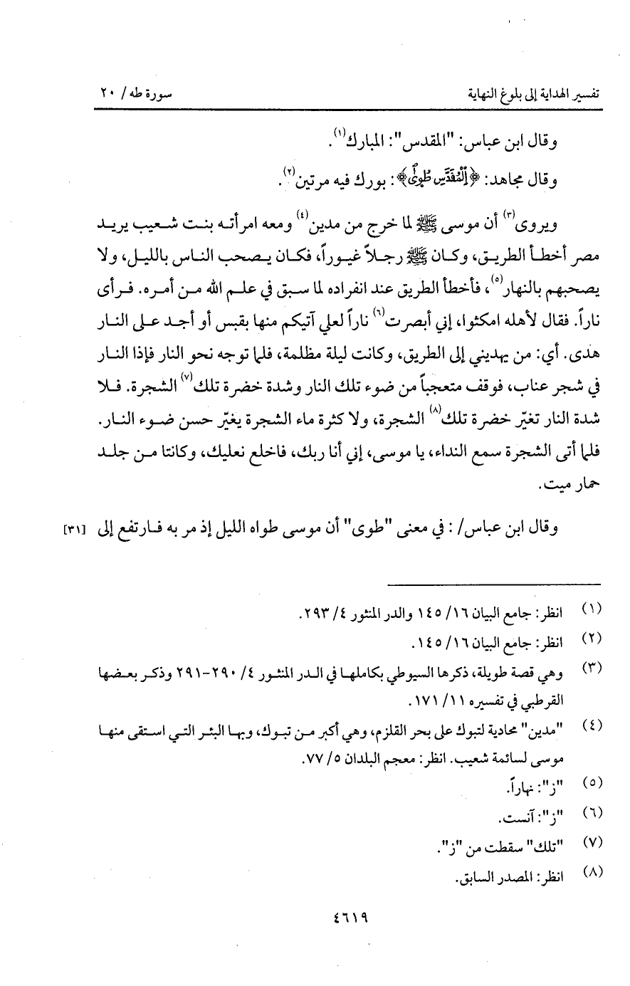 ويروى أن موسى A لما خرج من مدين ومعه امرأته بنت شعيب ريد مصر أخطأ الطريق، وكان A رجلاً غيوراً، فكان يصحب الناس بالليل، ولا يصحبهم بالنهار، فأخطأ الطريق عند انفراده لما سبق في علم الله من أمره. فرأى ناراً. فقال لأهله امكثوا، إني أبصرت ناراً لعلي آتيكم منها بقبس أو أجد على النار هدى. أي: من يهديني إلى الطريق، وكانت ليلة مظلمة، فلما توجه نحو النار فإذا النار في شجر عناب، فوقف متعجباً من ضوء تلك النار وشدة خضرة تلك الشجرة. فلا شدة النار تغيّر خضرة تلك الشجرة، ولا كثرة ماء الشجرة يغيّر حسن ضوء النار. فلما أتى الشجرة سمع النداء، يا موسى، إني أنا ربك، فاخلع نعليك، وكانتا من جلد حمار ميت.