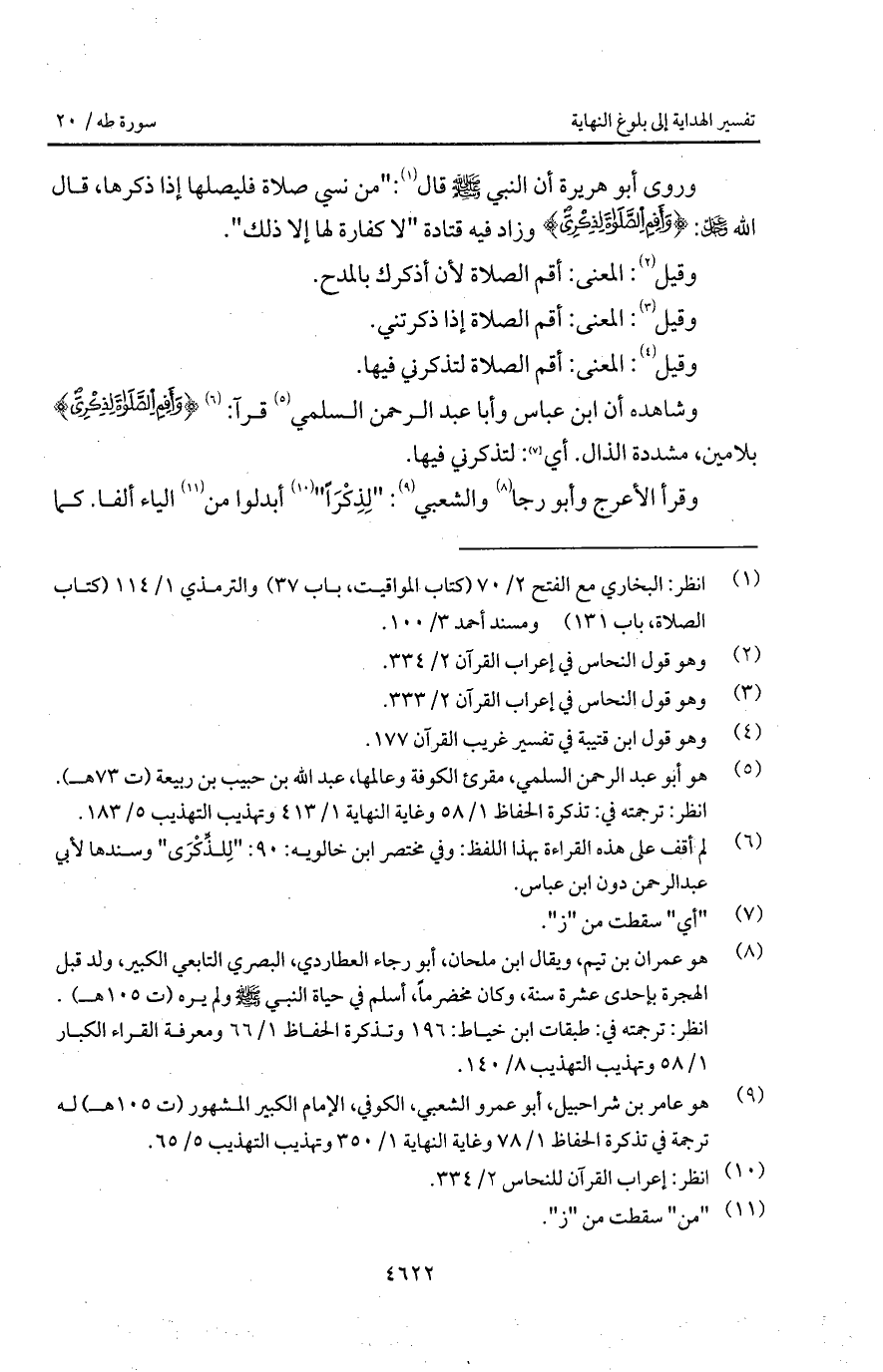 ورو ى أبو هريرة أن النبي A قال: " من نسي صلاة فليصلها إذا ذكرها "، قال الله D: { وَأَقِمِ الصلاة لذكري} وزاد فيه قتادة " لا كفارة لها إلا ذلك ".