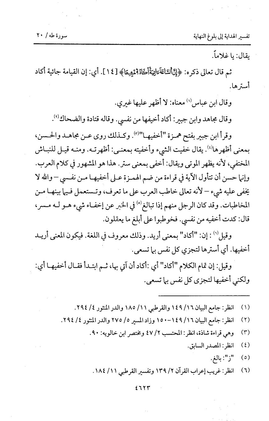 وقيل: إن تمام الكلام " أكاد " أي: أكاد أن آتي بها، ثم ابتدأ فقال أخفيها أي: ولكني أخفيها لتجزى كل نفس بما تسعى.