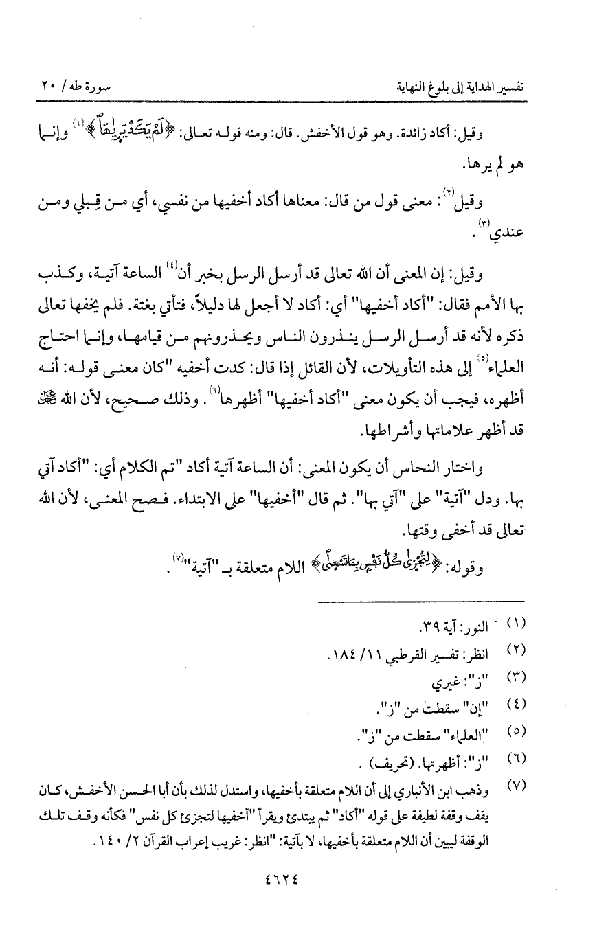 وقيل: إن المعنى أن الله تعالى قد أرسل الرسل بخبر أن الساعة آتية، وكذب بها الأمم فقال: " أكاد أخفيها " أي: أكاد لا أجعل لها دليلاً، فتأتي بغتة. فلم يخفها تعالى ذكره لأنه قد أرسل الرسل ينذرون الناس ويحذرونهم من قيامها، وإنما احتاج العلماء إلى هذه التأويلات، لأن القائل إذا قال: كدت أخفيه " كان معنى قوله: أنه أظهره، فيجب أن يكون معنى " أكاد أخفيها " أظهرها. وذلك صحيح، لأن الله D قد أظهر علاماتها وأشراطها.