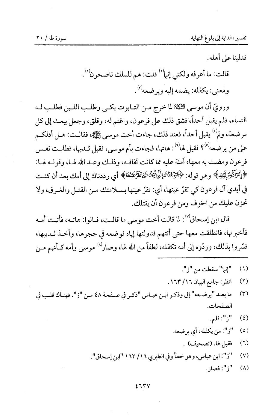 قال ابن إسحاق: لما قالت أخت موسى ما قالت، قالوا: هاته، فأتت أمه فأخبرتها، فانطلقت معها حتى أتتهم فناولتها إياه فوضعه في حجرها، وأخذ ثدييها، فسّروا بذلك، وردّوه إلى أمه تكفله، لطفاً من الله لها، وصار موسى وأمه كأنهم من