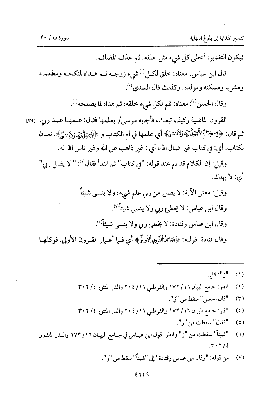 القرون الماضية وكيف تبعث، فأجابه موسى/ بعلمها فقال: علمها عند ربي. ثم قال: {فِي كِتَابٍ لاَّ يَضِلُّ رَبِّي وَلاَ يَنسَى} أي علمها في أم الكتاب و {لاَّ يَضِلُّ رَبِّي وَلاَ يَنسَى}.