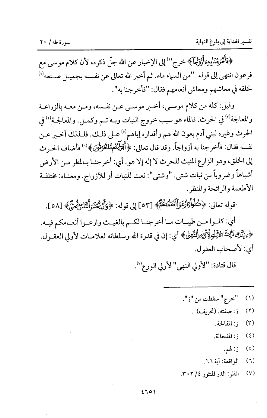 وقيل: كله من كلام موسى، أخبر موسى عن نفسه، ومن معه بالزراعة والمعالجة في الحرث. فالماء هو سبب خروج النبات وبه تم وكمل. والمعالجة في الحرث غيره لبني آدم بعون الله لهم وأقادره إياهم على ذلك. فلذلك أخبر عن نفسه فقال: فأخرجنا به أزواجاً. وقد قال تعالى: {أَفَرَأَيْتُم مَّا تَحْرُثُونَ} [الواقعة: 63] فأضاف الحرث إلى الخلق، وهو الزارع المنبث للحرث لا إله إلا هو. أي: أخرجنا بالمطر من الأرض أشابهاً وضروباً من نبات شتى. " وتشى ": نعت للنبات أو للأزواج. ومعناه: مختلفة الأطعمة والرائحة والمنظر.