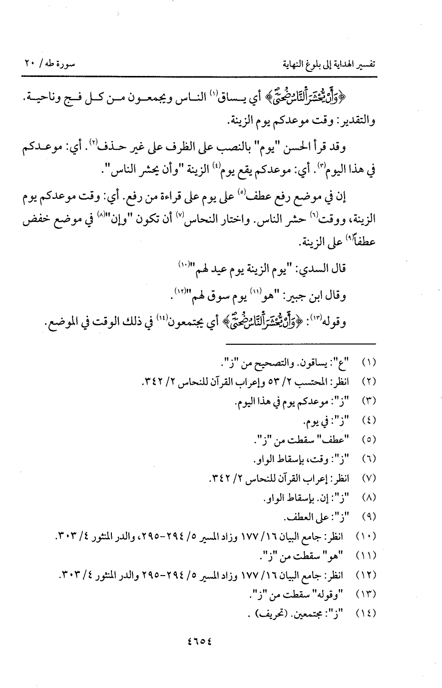 وقد قرأ الحسن " يوم " بالنصب على الظرف على غير حذف. أي: موعدكم في هذا اليوم. أي: موعدكم يقع يوم الزينة " وأن يحشر الناس ".