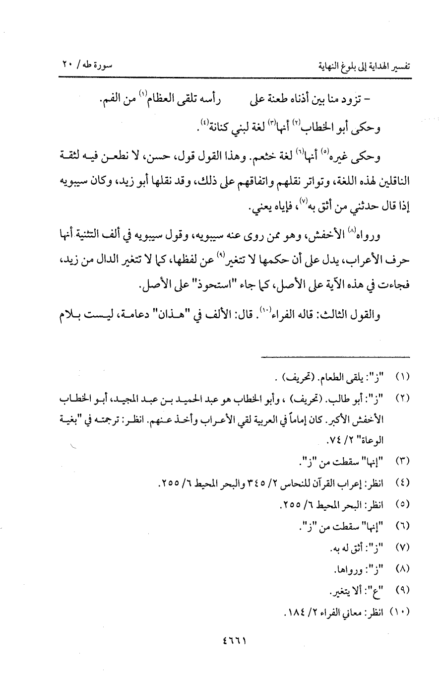 ورواه الأخفش، وهو ممن روى عنه سيبويه، وقول سيبويه في ألف التثنية أنها حرف الأعراب، يدل على أن حكمه لا تتغير عن لفظها، كما لا تتغير الدال من زيد، فجاءت في هذه الآية على الأصل، كما جاء " استحوذ " على الأصل.