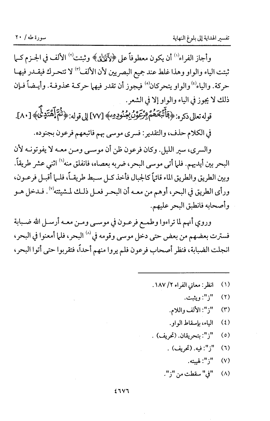وأجاز الفراء أن يكون معطوفاً على {لاَّ تَخَافُ} وثبتت الألف في الجزم كما ثبتت الياء والواو وهذا غلط عند جميع البصريين لأن الألف لا تتحرك فيقدر فيها حركة. والياء والواو يتحركان فيجوز أن تقدر فيهما حركة محذوفة. وأيضاً فإن ذلك لا يجوز في الياؤ والواو إلا الشعر.