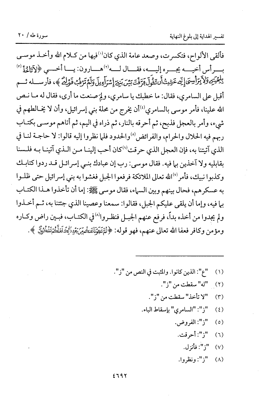 فألقى الألواح، فتسكرت، وصعد عامة الذي كان فيها من كلام الله وأخذ موسى برأس أخيه يجره إليه، فقال له هارون: يا أخي {لاَ تَأْخُذْ بِلِحْيَتِي وَلاَ بِرَأْسِي إِنِّي خَشِيتُ أَن تَقُولَ فَرَّقْتَ بَيْنَ بني إِسْرَآءِيلَ وَلَمْ تَرْقُبْ قَوْلِي}، فأرسله ثم أقبل على السامري، فقال: ما خطبك يا سامري، ولِمَ صنعت ما أرى، فقال له ما نص الله علينا، فأمر موسى بالسامري أن يخرج من محلة بني إسرائيل، وأن لا يخالطهم في شيء، وأمر بالعجل فذبح، ثم أحرقه بالنار، ثم ذراه في اليم، ثم أتاهم موسى بكتاب ربهم فيه الحلال والحرام، والفرائض والحدود فلما نظروا إليه قالوا: لا حاجة لنا في الذي آتيتنا به، فإن العجل الذي حرقت كان أحب إلينا من الذي آتينا به فلسنا بقابليه ولا آخذين بما فيه. فقال موسى: رب إن عبادك بني إسرائيل قد ردوا كتابك وكذبوا نبيك، فأمر الله تعالى الملائكة فرفعوا الجبل فغشوا به بني إسرائيل حتى ظلوا به عسكرهم، فحال بينهم وبين السماء، فقال موسى A: إما أن تأخذوا هذا الكتاب بما فيه، وإما أن يلقى عليكم الجبل، فقالوا: سمعنا وعصينا الذي جئتنا به، ثم أخذوا ولم يجدوا من أخذه بداً، فرفع عنهم الجبل فنظروا في الكتاب، فبين راض وكاره ومؤمن وكافر فعفا الله تعالى عنهم، فهو قوله: {ثُمَّ عَفَوْنَا عَنكُم مِّن بَعْدِ ذَلِكَ لَعَلَّكُمْ تَشْكُرُونَ}.