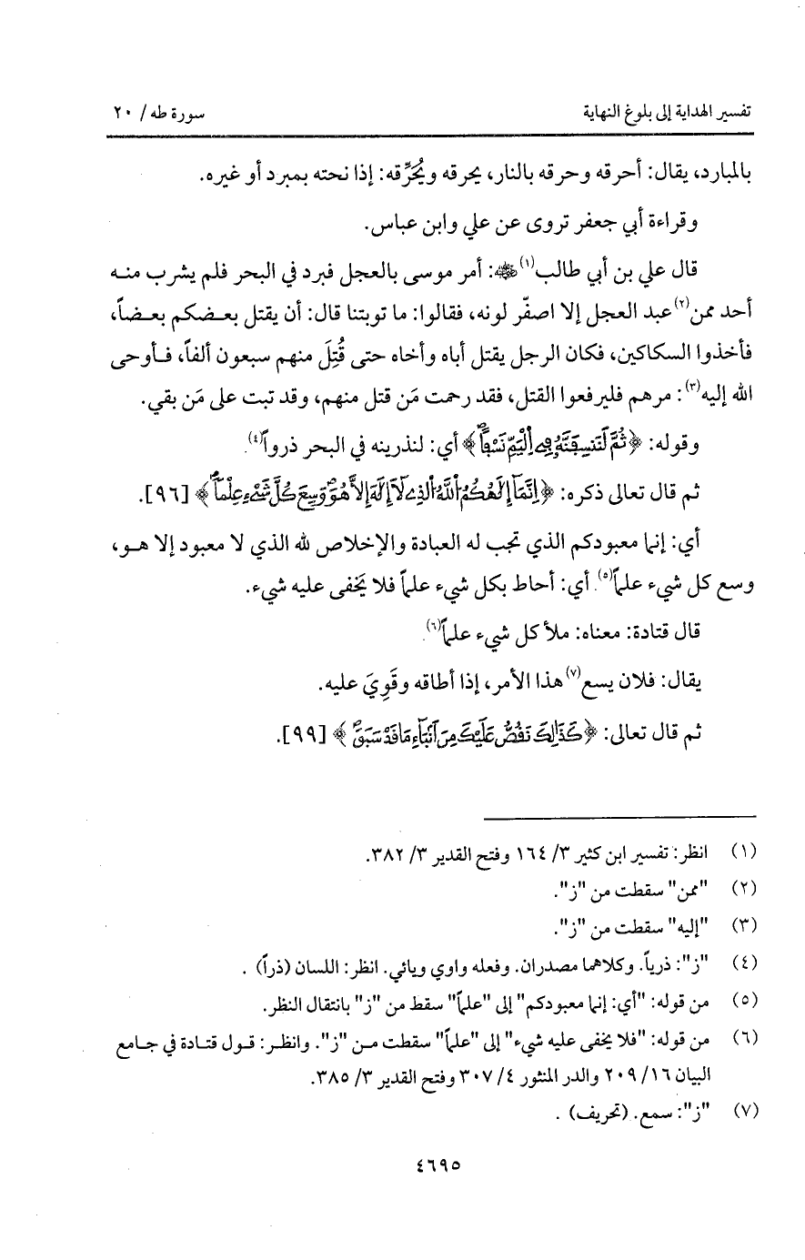 قال علي ابن أبي طالب Bهـ: أمر موسى بالعجل فبرج في البحر فلم يشرب منه أحد ممن عبد العجل إلا اصفّر لونه، فقالوا: ما توبتنا قال: أن يقتل بعضكم بعضاً، فأخذوا السكاكين، فكان الرجل يقتل أباه وأخاه حتى قُتِلَ منهم سبعون ألفاً، فأوحى الله إليه: مرهم فليرفعوا القتل، فقد رحمت مَن قتل منهم، وقد تبت على مَن بقي.