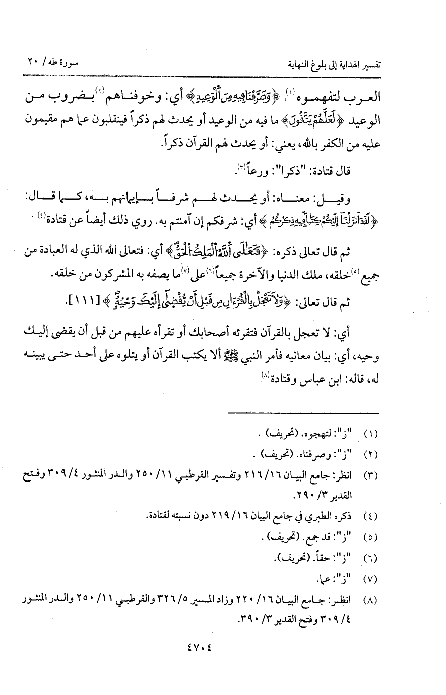 أي: لا تعجل بالقرآن فتقرئه أصحابك أو تقرأه عليهم من قبل أن يقضى إليك وحيه، أي: بيان معانيه فأمر النبي A ألا يكتب القر آن أو يتلوه على أحد حتى يبينه له، قال: ابن عباس وقتادة.