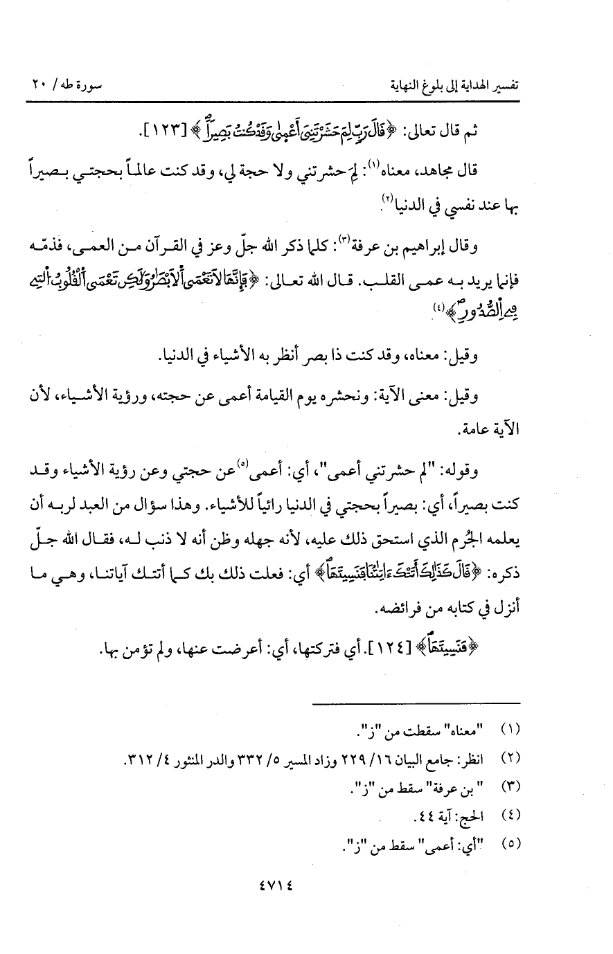 وقوله: " لم حشرتني أعمى "، أي: أعمى عن حجتي وعن رؤية الأشياء وقد كنت بصيراً، أي بصيراً بحجتي في الدنيا رائياً للأشياء.